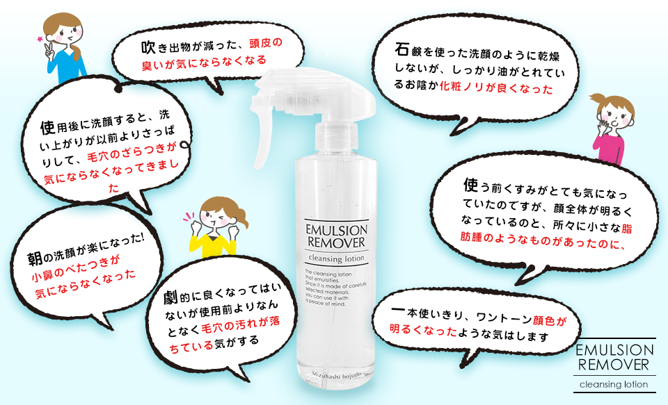 - 安心してください。エマルジョンリムーバーの効果がなくなったわけではありません。お客様のお肌に蓄積した不要な脂分が落せているということです。その調子でご利用いただければ、ますます美肌が期待できます!