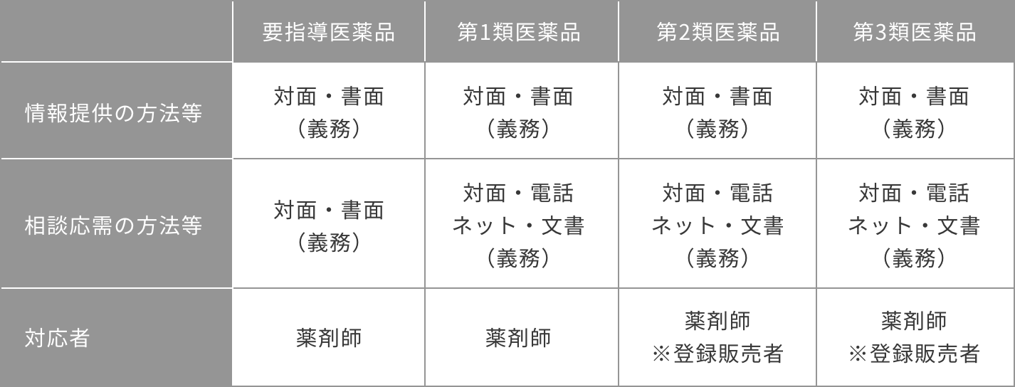 要指導医薬品、第1類医薬品、第2類医薬品及び第3類医薬品には、情報提供の義務及び対応する資格者に違いがあります。